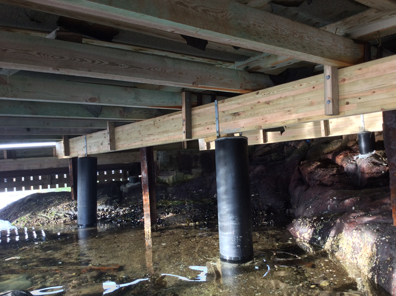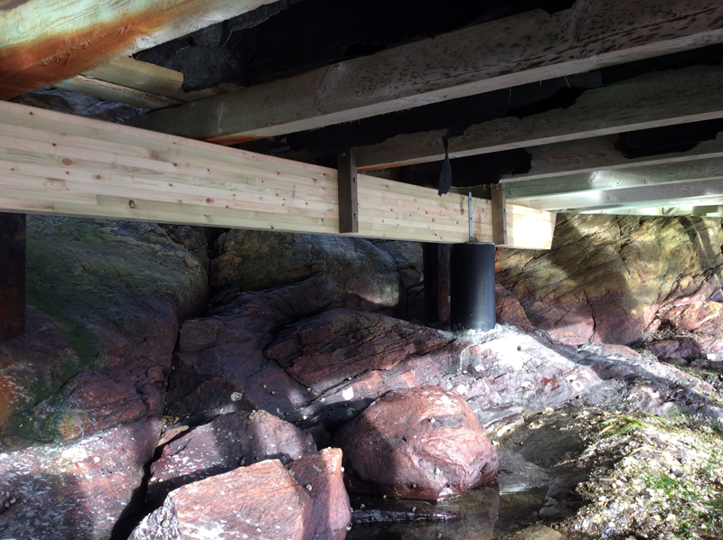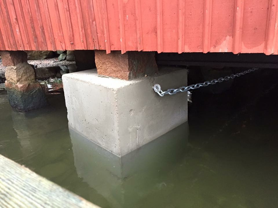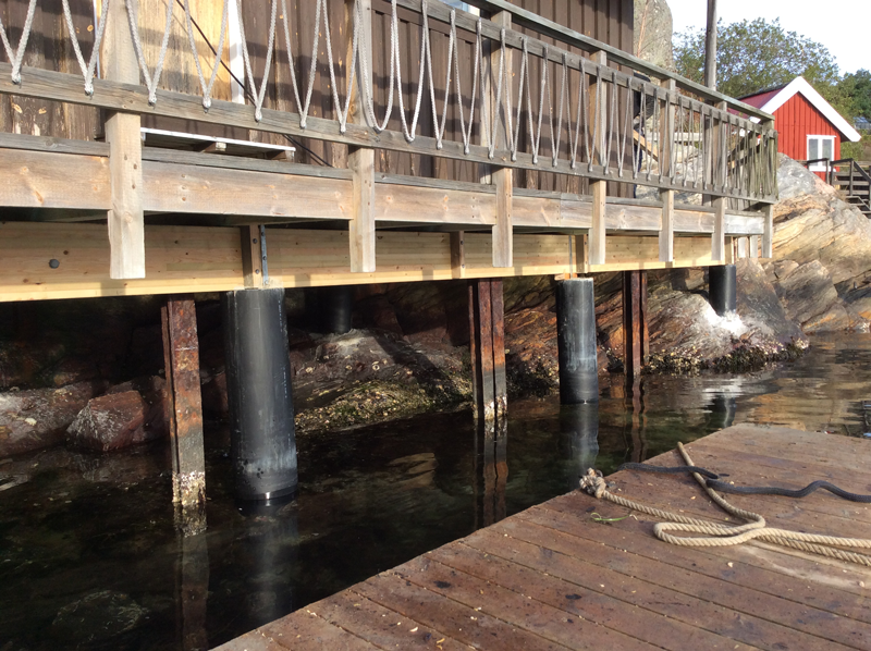 Vi har utvecklat ett koncept för grundläggning av sjöbodar. Systemet bygger på stålpålning eller borrning i berg som ingjutes i sin helhet i korrosionsskyddande betong. Som sekundärkonstruktion används specialbehandlad limträbalk. Detta system bygger på en lika lång livslängd av stommen som på resterande sjöbod vilket gör att ett komplicerat byte av grundstomme kan undvikas.